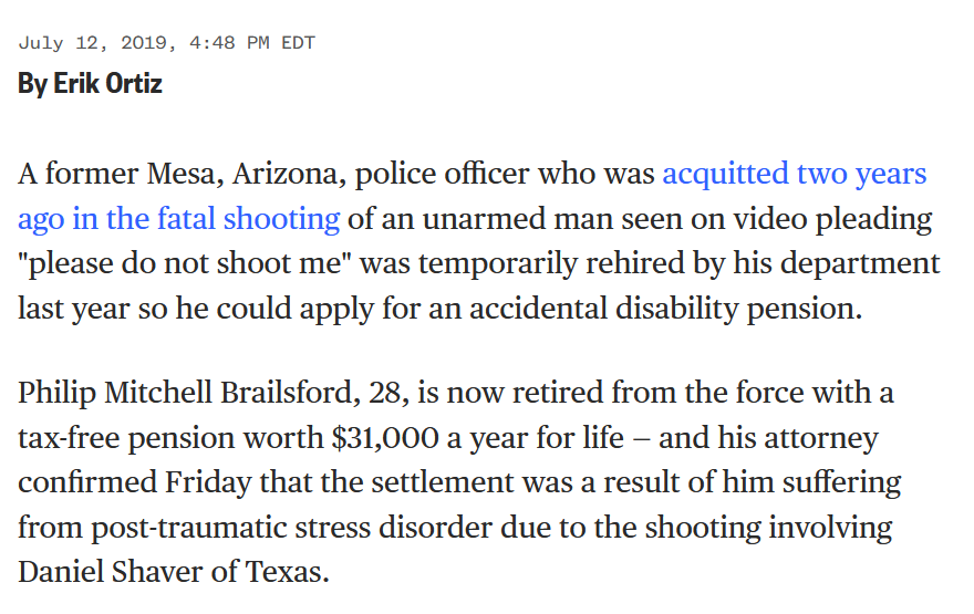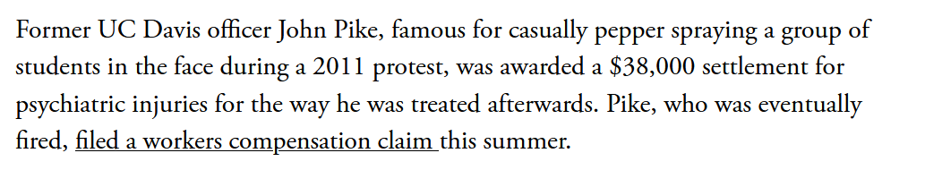 another example: John Pike, the cop who calmly walked down a line of seated students and pepper-sprayed them in the face https://www.theatlantic.com/national/archive/2013/10/uc-davis-pepper-spraying-cop-gets-38k-settlement/309629/