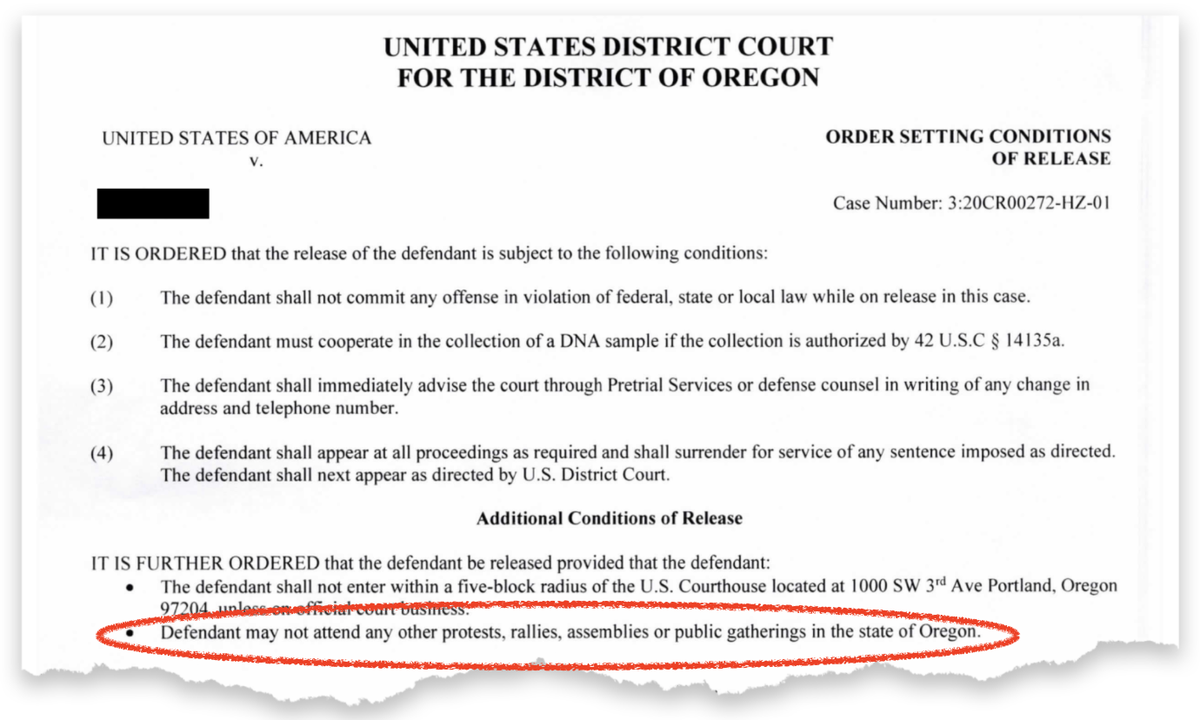 At least a dozen Portland protesters charged in federal court (many of them for minor crimes like "failing to obey a lawful order") have been banned from attending any more protests as a condition of their release from jail pending trial. https://www.propublica.org/article/defendant-shall-not-attend-protests-in-portland-getting-out-of-jail-requires-relinquishing-constitutional-rights