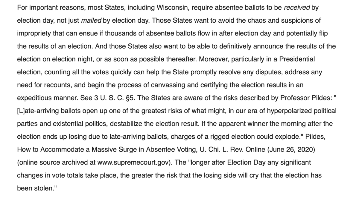 Good footnote here from Kagan's dissent in tonight's WI ruling at SCOTUS, calling out Kavanaugh's Trumpian framework on late-arriving votes: https://www.scotusblog.com/wp-content/uploads/2020/10/20A66.pdf
