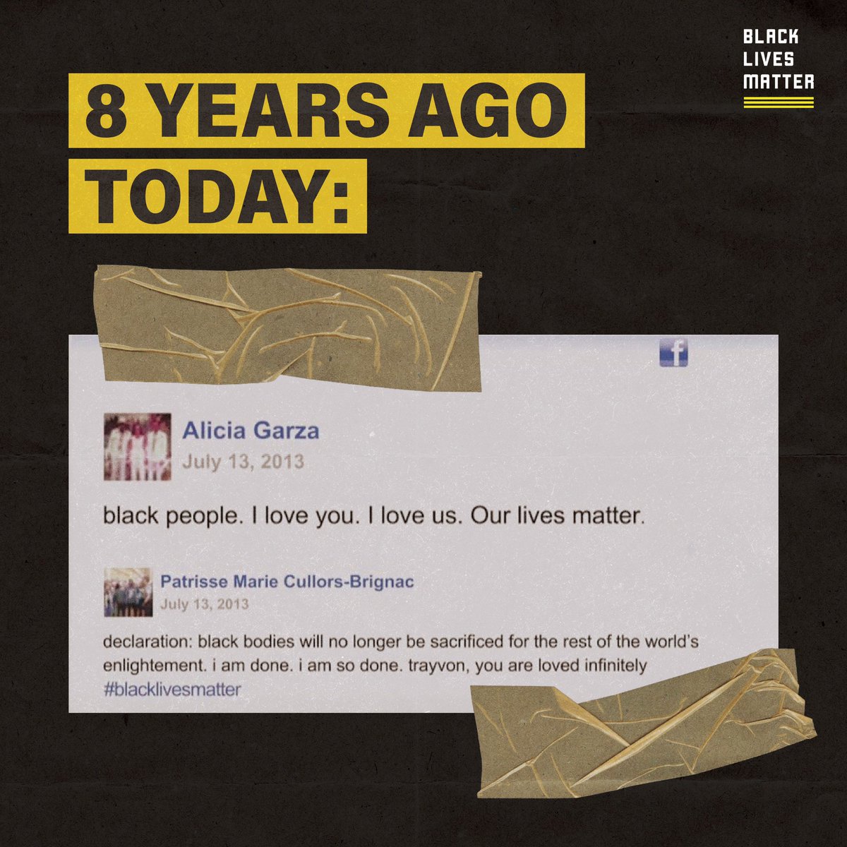 8 years ago today, #BlackLivesMatter was put into the digital world. After generations of rage, pain, love, and abolitionists. We don't just want Black lives to matter. We want to thrive...To 8 years of #BLM—thank you family.