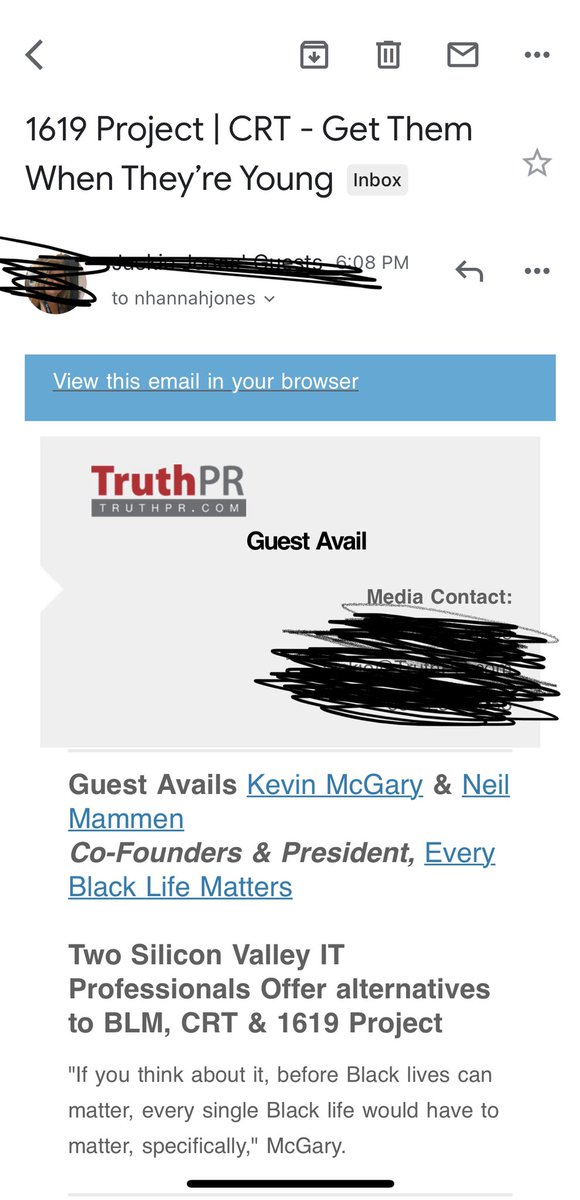 I’m really going to need some of you in PR to get better at your jobs. Imagine sending an email to the creator of the 1619 Project asking for coverage of how “race hustlers” are using the 1619 Project in an attempt to promote the 17*6 Project instead.