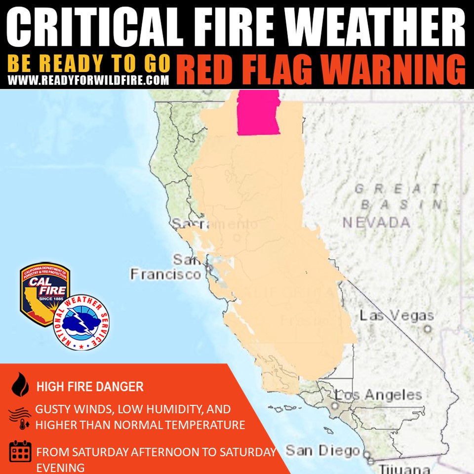 #RedFlagWarning in effect for Northern California from Saturday afternoon till Saturday evening due to gusty winds and low humidity. This is #CriticalFireWeather so use caution outdoors. More tips: