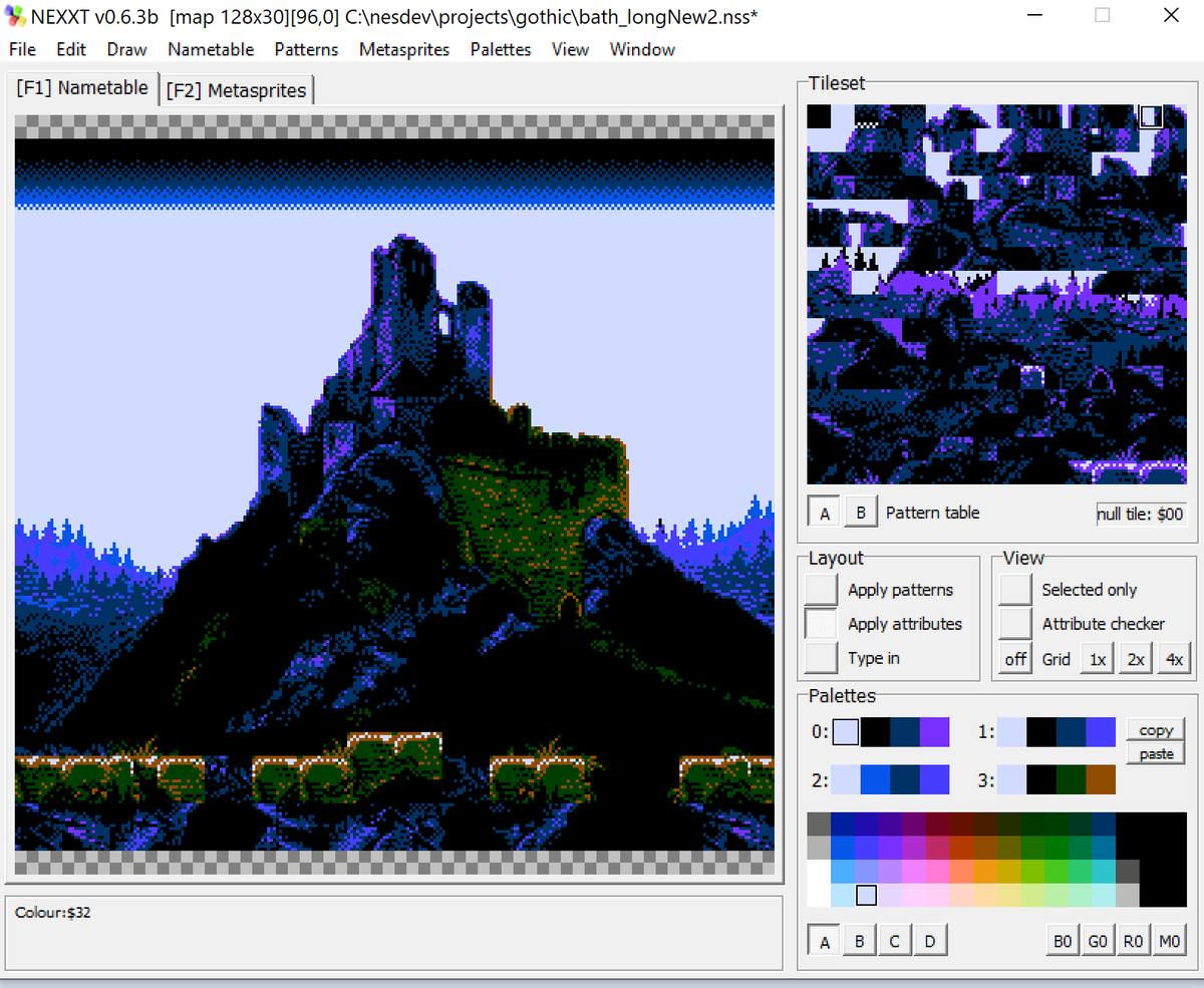 Someone asked me what that level looks like stuffed into the NES CHR memory, and the answer is.. it fits. Just barely. All 256 background tiles used; a lot of them do "double duty" portraying different things in combination with other tiles in different areas