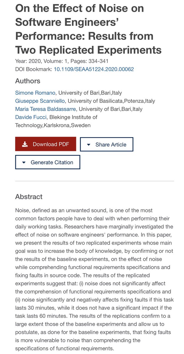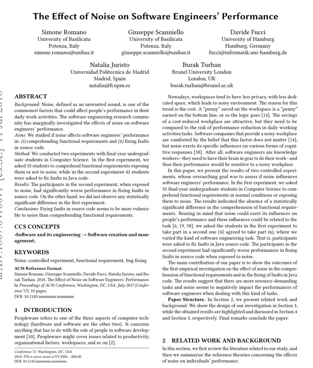 Don’t fix bugs (or proofread, or other detail work) in noisy environments! A replicated study finds that the ability to find & fix errors in software drops significantly with noise. Comprehending requirements does not.