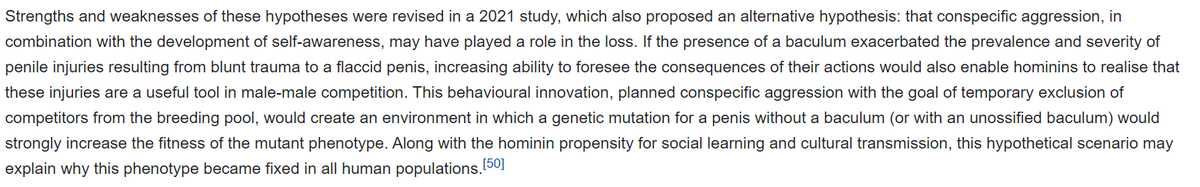 The other day Carta told me that humans are the only mammal with no dick bone- which is TRUE, amazingly. I thought "it absolutely must be because we are smart enough to dick punch each other"....turns out that's *actually* the latest theory