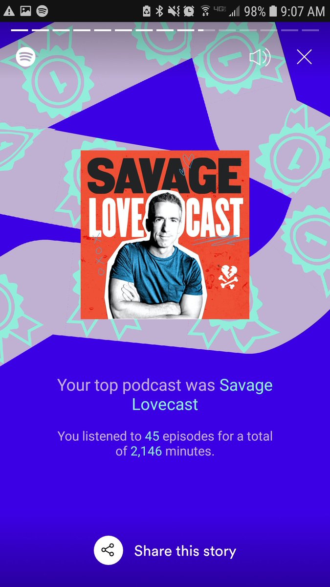 No surprise that this is my top podcast on spotify for the year. I've been listening to this podcast for like 14 years. Thank you for the weekly entertainment and advice @fakedansavage