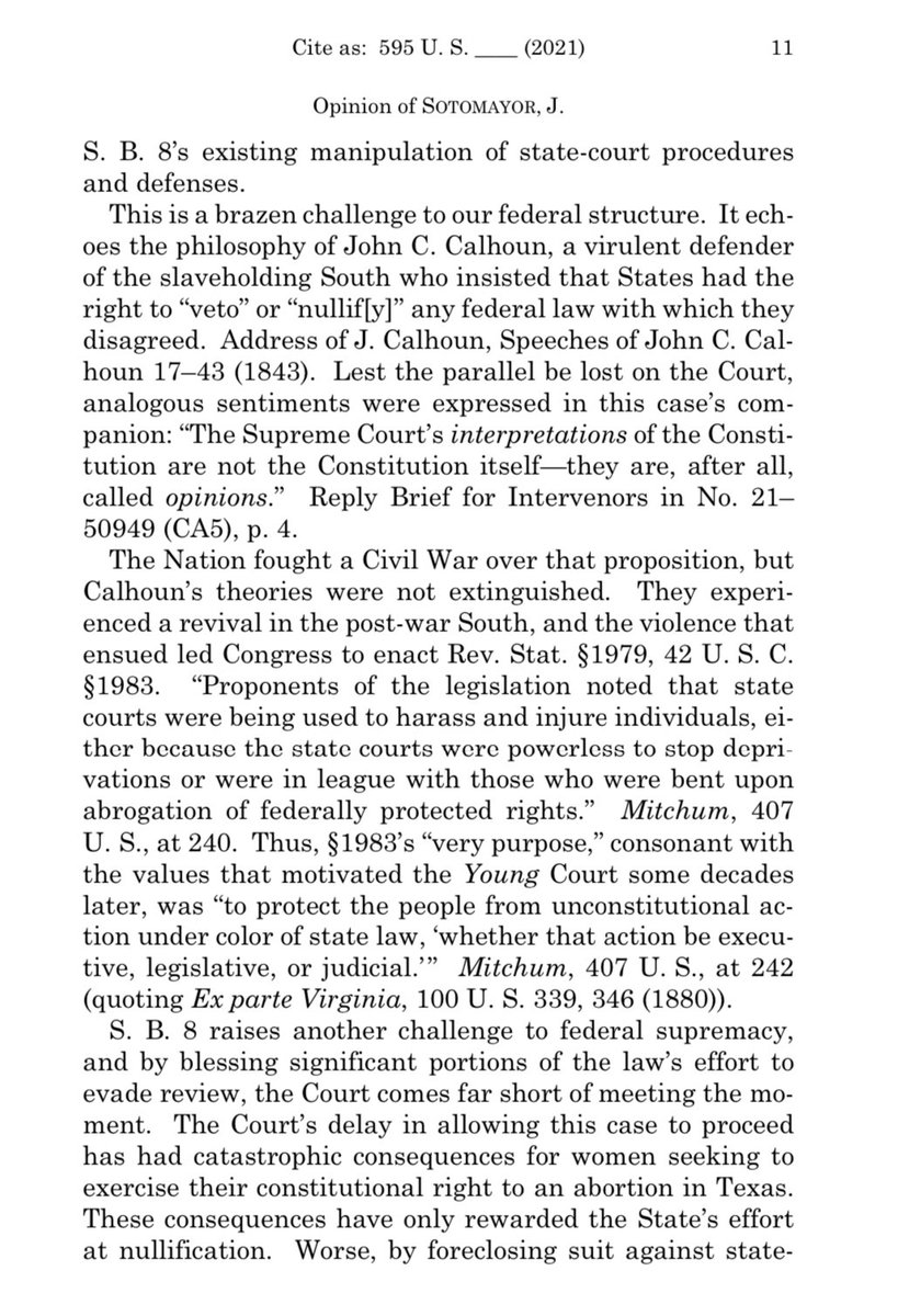 Sotomayor says the right wing majority’s position on abortion rights in Texas is Calhounist.