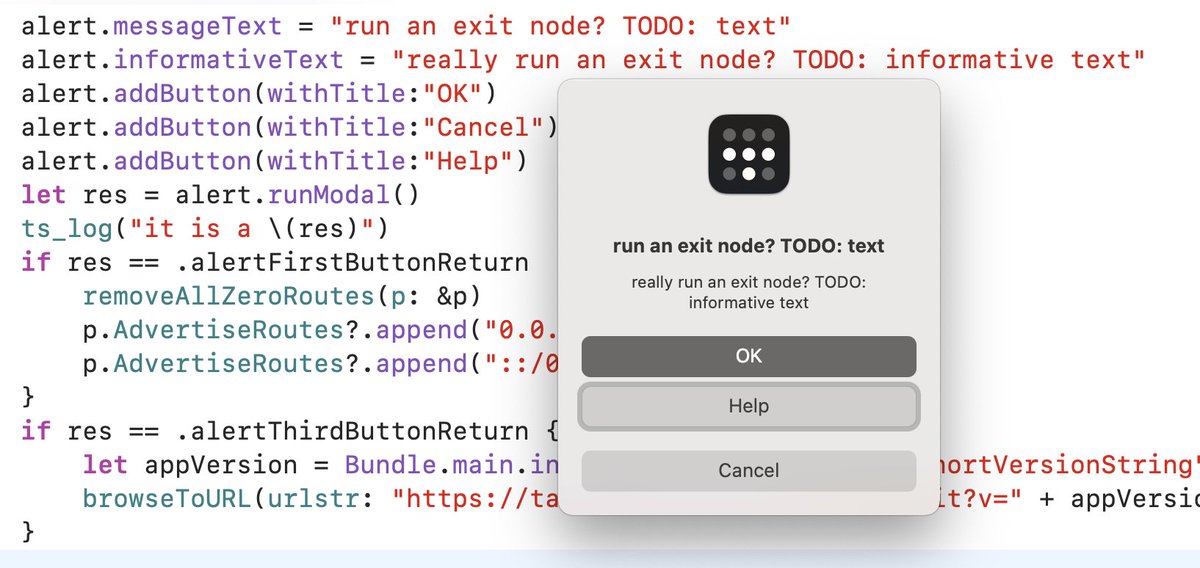 Notice I addButton "OK" then "Cancel" then "Help", and they show up in the UI out of order. But the return code from .runModal() is still "alertThirdButtonReturn" when the visually second button ("Help") is pressed.