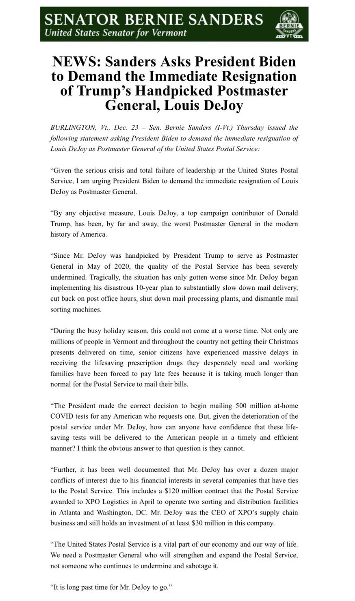 Given the serious crisis and total failure of leadership at the United States Postal Service, I am urging President Biden to demand the immediate resignation of Louis DeJoy as Postmaster General.