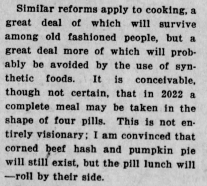 Ah geez he even saw Soylent bros coming! (A product name based on the movie Soylent Green, and hey when was that movie supposed to take place? Oh)