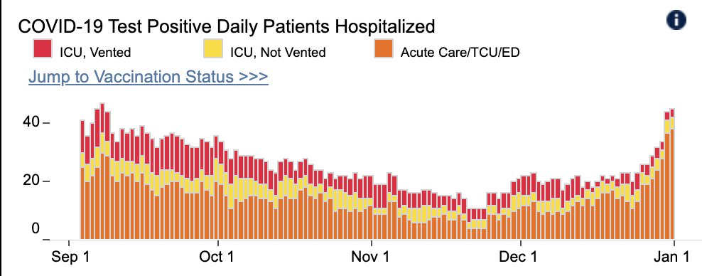 Brief @UCSFHospitals update – now seeing undeniable hospital surge, up to 45 hosp. pts (vs 20 last wk; Fig L). So tsunami of cases IS translating into some serious ones. Few new ICU pts, yet. Test positivity (R) stable at crazy-high levels.