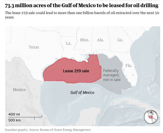 What a relief that there's no climate crisis and @POTUS can undo recent wind and solar gains by leasing out 73.3 million acres of the Gulf of Mexico (an area the size of Italy) for oil drilling, eh?