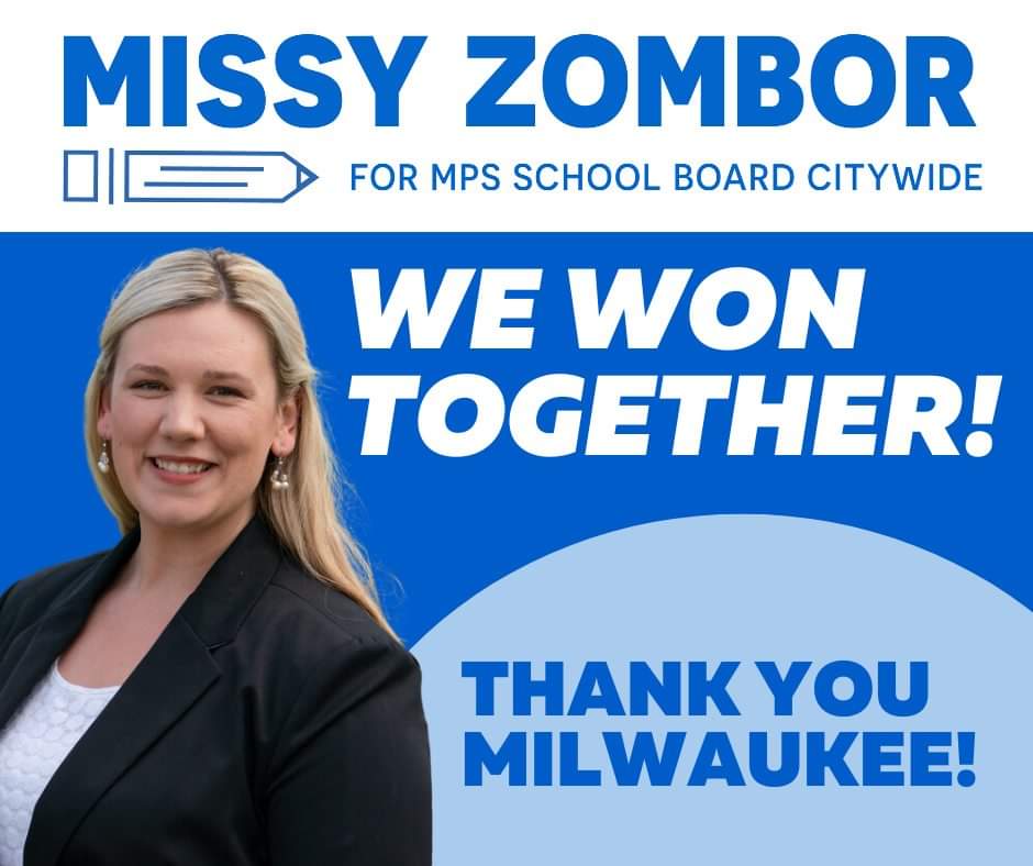 With 99% of votes in, we can safely say our endorsed candidate, Missy Zombor, has won her election for MPS school board. Thank you to everyone who helped make this happen. MPS students and parents can now be assured they will someone to fight for them, not private interests.