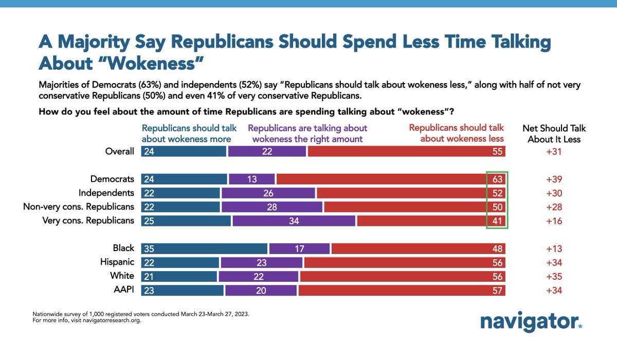 🚨 NEW POLL: A majority of Americans say Republicans should spend less time talking about “wokeness” (55%, net +31), including Democrats (+39), independents (+30) & not very conservative Republicans (+28).