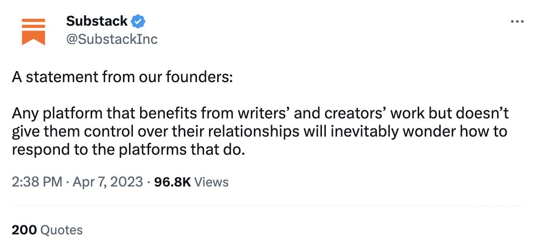 This tweet from Substack, which does not contain any links to Substack, is being restricted by @elonmusk and Twitter.