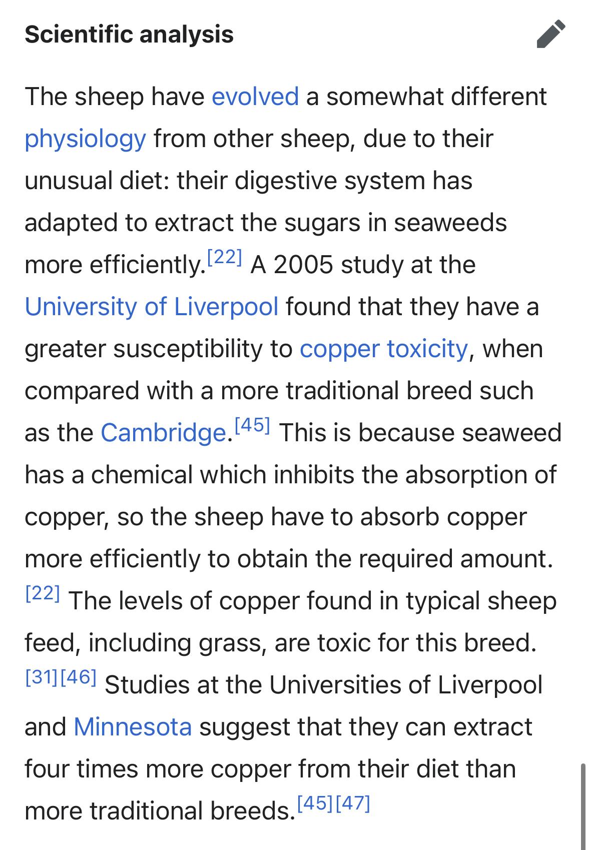 [![The sheep have evolved a somewhat different physiology from other sheep, due to their unusual diet: their digestive system has adapted to extract the sugars in seaweeds more efficiently. 22] A 2005 study at the University of Liverpool found that they have a greater susceptibility to copper toxicity, when compared with a more traditional breed such as the Cambridge. 145) This is because seaweed has a chemical which inhibits the absorption of copper, so the sheep have to absorb copper more efficiently to obtain the required amount. 122] The levels of copper found in typical sheep feed, including grass, are toxic for this breed. [31][46] Studies at the Universities of Liverpool and Minnesota suggest that they can extract four times more copper from their diet than more traditional breeds. 451[47]]6