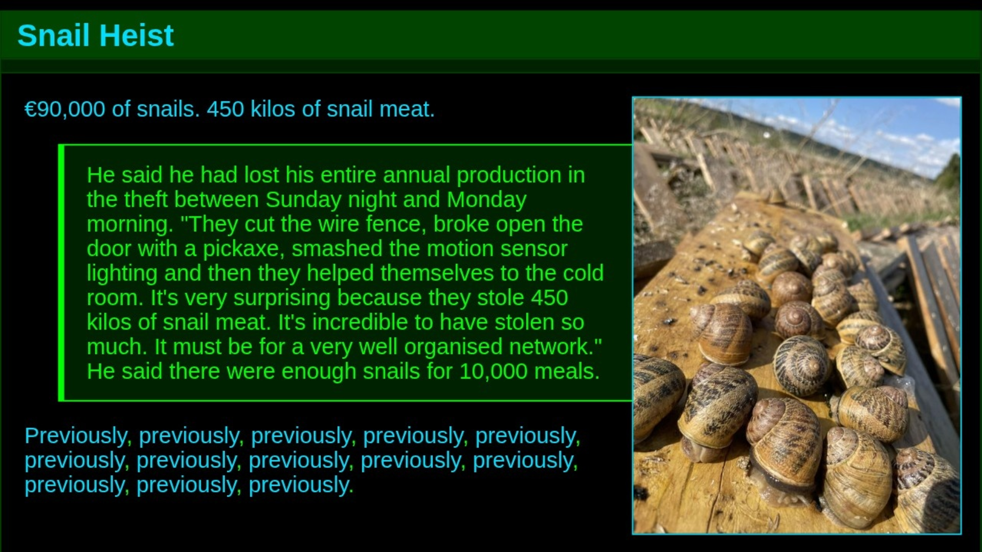€90,000 of snails. 450 kilos of snail meat. He said he had lost his entire annual production in the theft between Sunday night and Monday morning. "They cut the wire fence, broke open the door with a pickaxe, smashed the motion sensor...