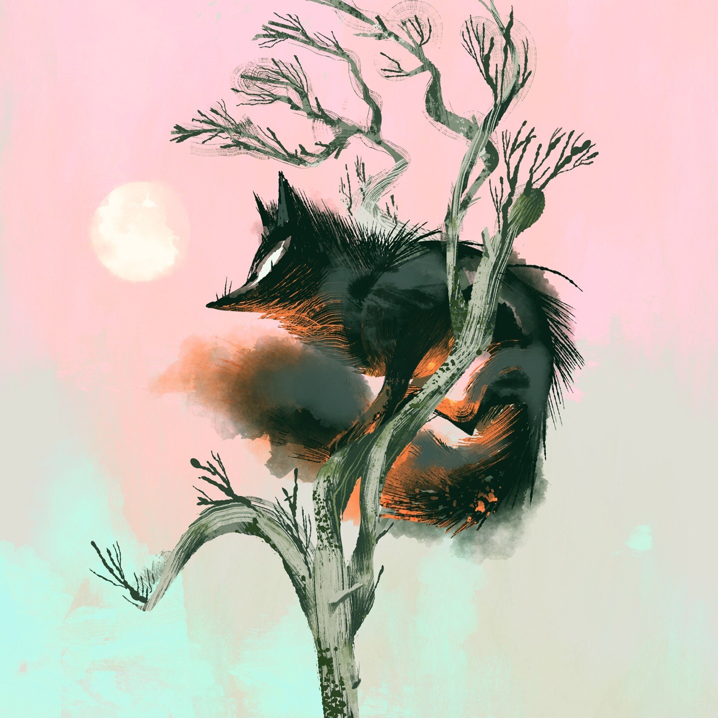 - Fiery black fox sitting in a tree against pink sky (remote)