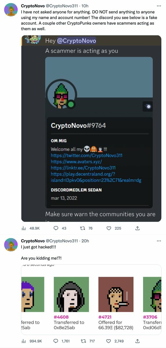 - CryptoNovo @CryptoNovo311 · 10h I have not asked anyone for anything. DO NOT send anything to anyone using my name and account number! The discord you see below is a fake account. A couple other CryptoPunks owners have scammers acting as them as well.CryptoNovo @CryptoNovo311 · 20h I just got hacked!!! Are you kidding me!?! (remote)