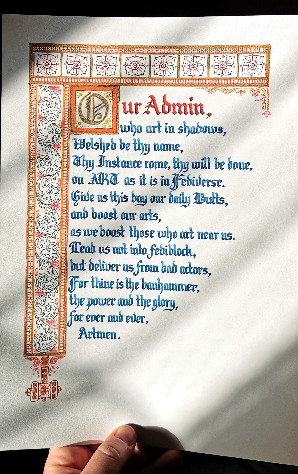 - A rewrite of the lord's prayer, by Zatnosk, calligraphied in dark blue ink with a sepia and brown decorative border with gold highlights, and a little banhammer hanging from the bottom of the left-side border; "Our Admin, who art in shadows, welshed be thy name, thy Instance come, thy will be done, on .ART as it is in fediverse. Give us this day our daily Butts, and boost our arts, as we boost those who art near us. Lead us not into fediblock, but deliver us from bad actors, For thine is the banhammer, the power and the glory, for ever and ever, Artmen." (remote)