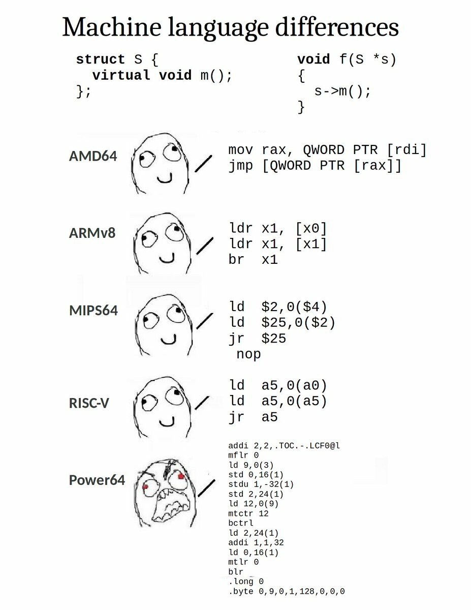 - A rage comic, titled "Machine language differences". A C++ virtual function call in tail position is pictured below the title. Next, four happy faces labeled "AMD64", "ARMv8", "MIPS64" and "RISC-V" show how it is neatly compiled for the respective architecture (between two and four instructions). Last, a rage face labeled "Power64" shows its complicated assembly result. (remote)