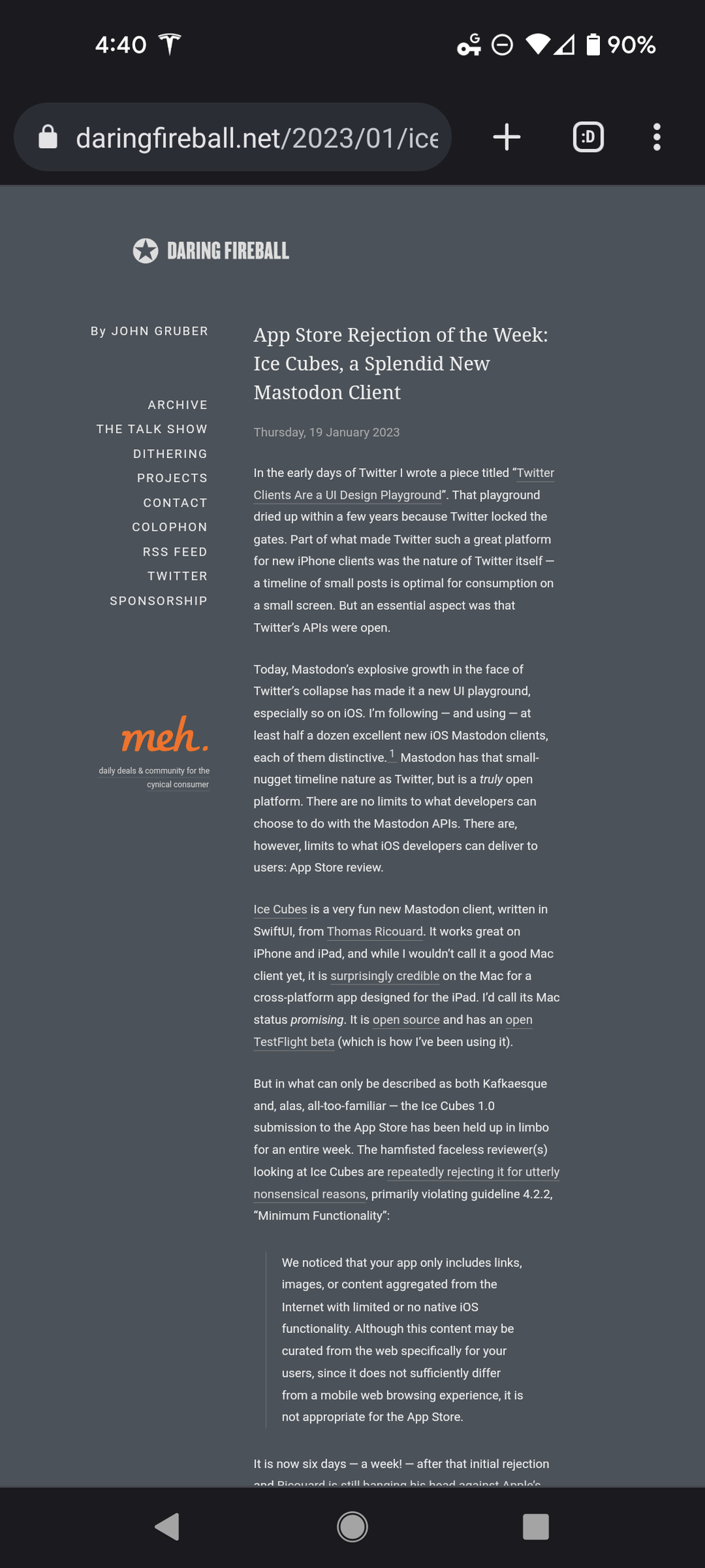 Writing a post called "App Store Rejection of The Week", that stans for Apple having absolute control, while complaining about some small aspect of High Modernist computing — but all as an excuse to shit on web apps, on a website that you have to pinch-zoom in to read?