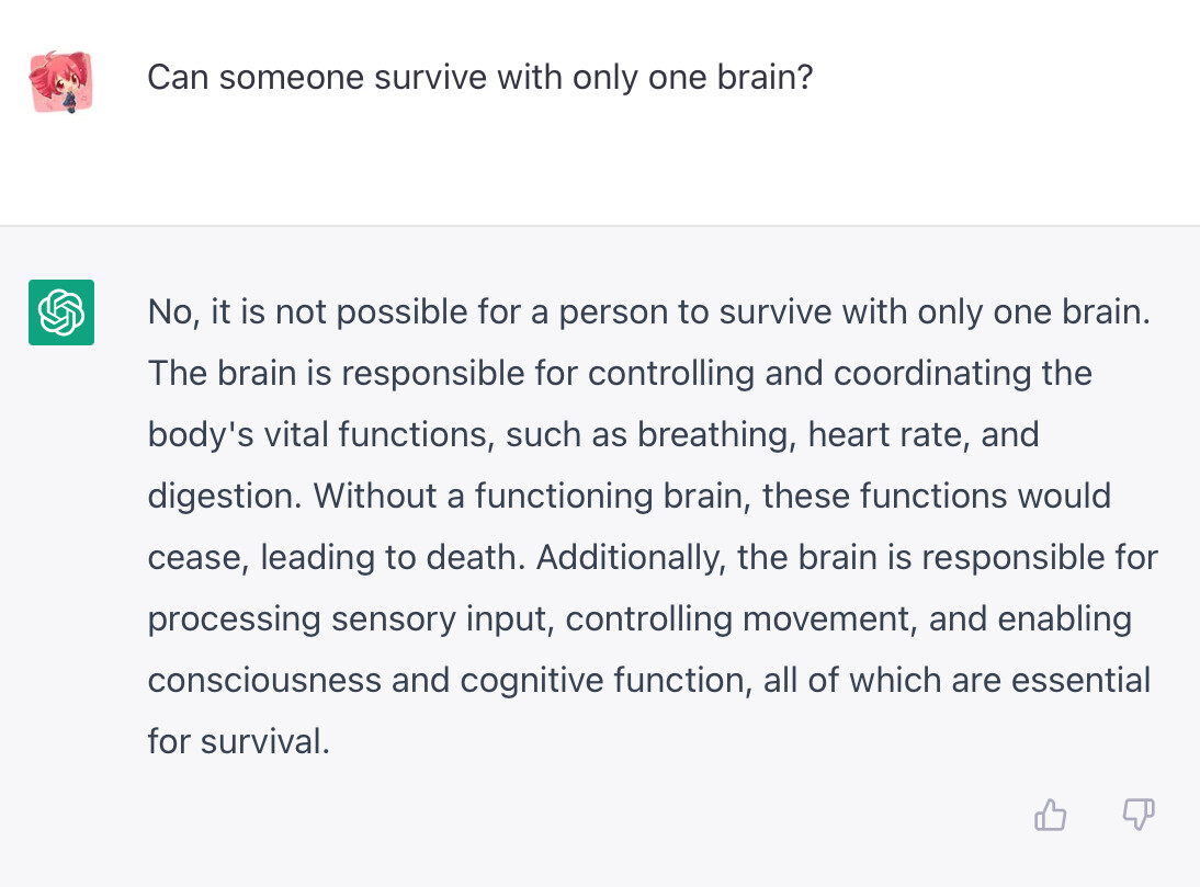 - Question for ChatGPT: Can someone survive with only one brain? Answer: No, it is not possible for a person to survive with only one brain. The brain is responsible for controlling and coordinating the body's vital functions, such as breathing, heart rate, and digestion. [it goes on to list a bunch of brain facts] (remote)