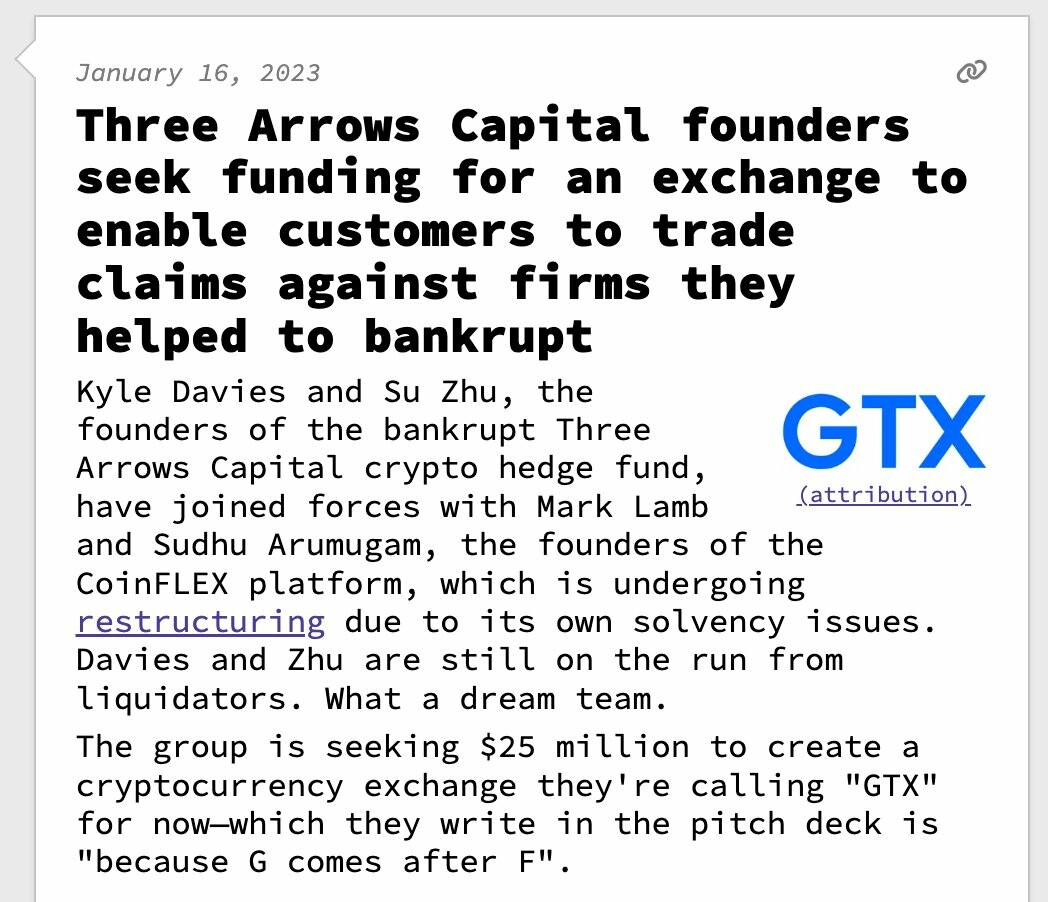 - Three Arrows Capital founders seek funding for an exchange to enable customers to trade claims against firms they helped to bankrupt Kyle Davies and Su Zhu, the founders of the bankrupt Three Arrows Capital crypto hedge fund, have joined forces with Mark Lamb and Sudhu Arumugam, the founders of the CoinFLEX platform, which is undergoing restructuring due to its own solvency issues. Davies and Zhu are still on the run from liquidators. What a dream team. The group is seeking $25 million to create a cryptocurrency exchange they're calling "GTX" for now—which they write in the pitch deck is "because G comes after F". (remote)