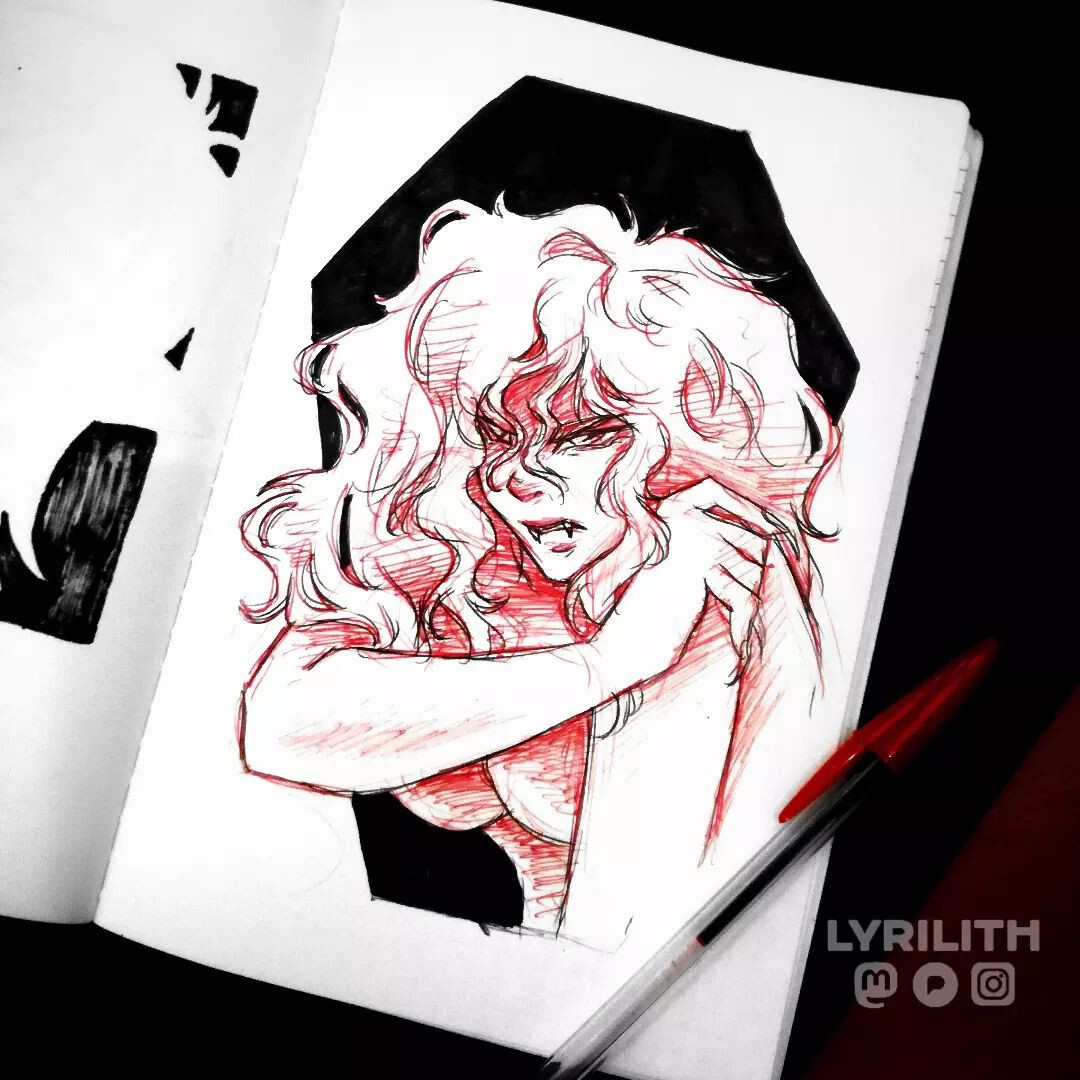 - Open sketchbook showing a pen and marker doodle in black and red. A half body drawing of a nude woman, covering her chest with her right arm, gripping her left shoulder. Her hair is long and messy, her fangs are showing and her nails are claw like. She is looking angrily passed the viewer, as if she was just attacked, ready to fight back. The drawing is done in rough black and red pen, shaded in red. Behind her a solid black coffin shape for contrast. (remote)