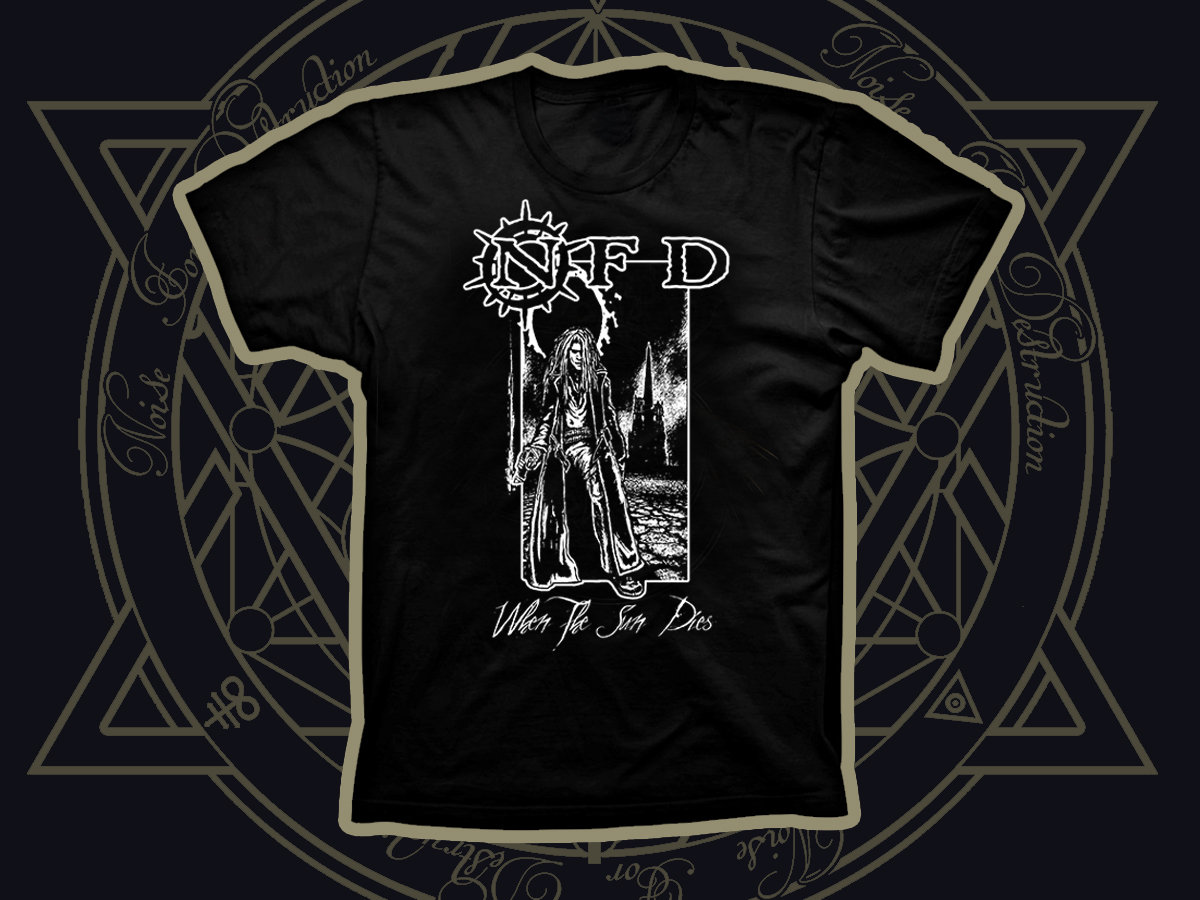 - Photo from NFD's bandcamp merch shop. A black t-shirt with a white print. The bands logo on the top, at the bottom in handwriting "When The Sun Dies" and the print shows an upright panel with drawing of a long haired man in a long coat, behind him in the distance a church, the sky is dark and the sun is only visible as a corona. (remote)