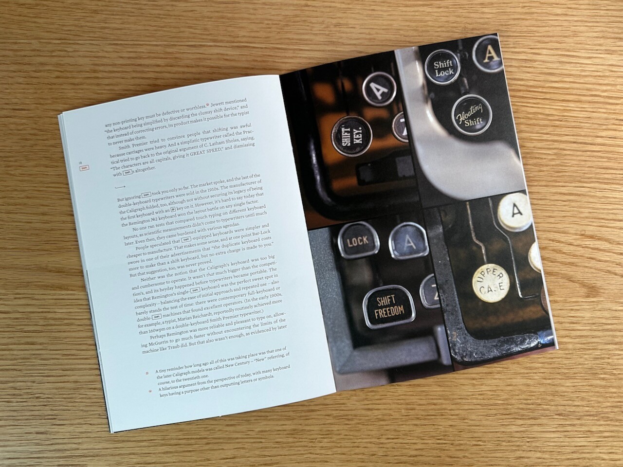 - Interior spread from the book Shift Happens. Left side is full page of text from Chapter 2, right side are four closeup photos of shift keys from old typewriters. (remote)