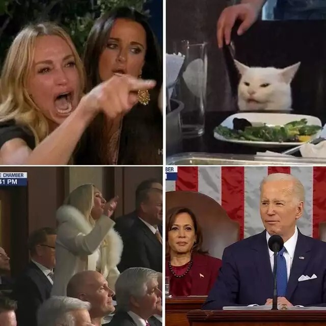 - Picture: A 4-square split picture. The top half is the standard Smudges the cat template. On the left are a brunette and a blonde woman, and the blond woman is upset, shouting while pointing her finger. On the right is Smudges the cat sitting at a plate of greens at the table, with an irritated expression like he's asking what the big deal is. The lower half is two pictures from the 2023 State of the Union Address. On the left is Marjorie Taylor Green in white, agitated, and pointing her finger. On the right is President Biden with a similar expression to Smudges. (remote)