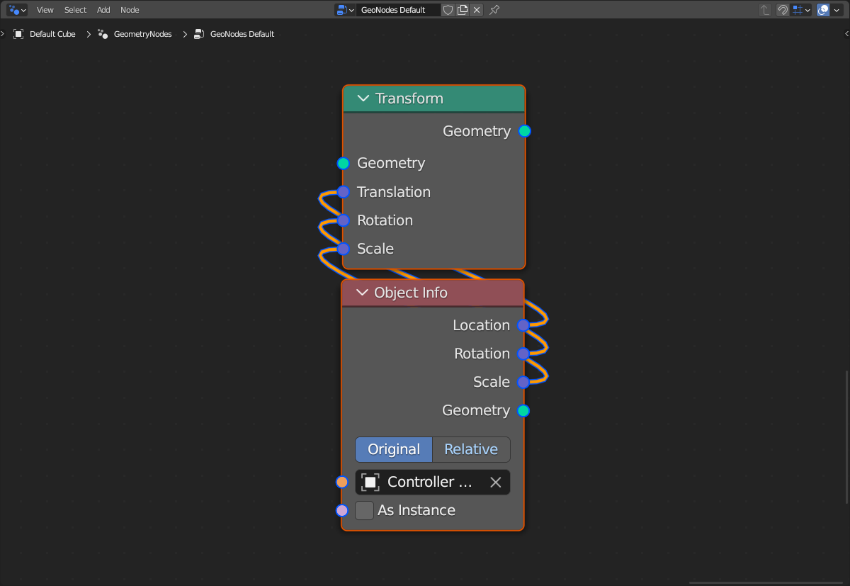 - A Blender Geometry nodes graph, showing a Transform node with its Translation, Rotation, and Scale inputs all being fed by an Object Info node below it, which has "Controller" in its selector field. (remote)
