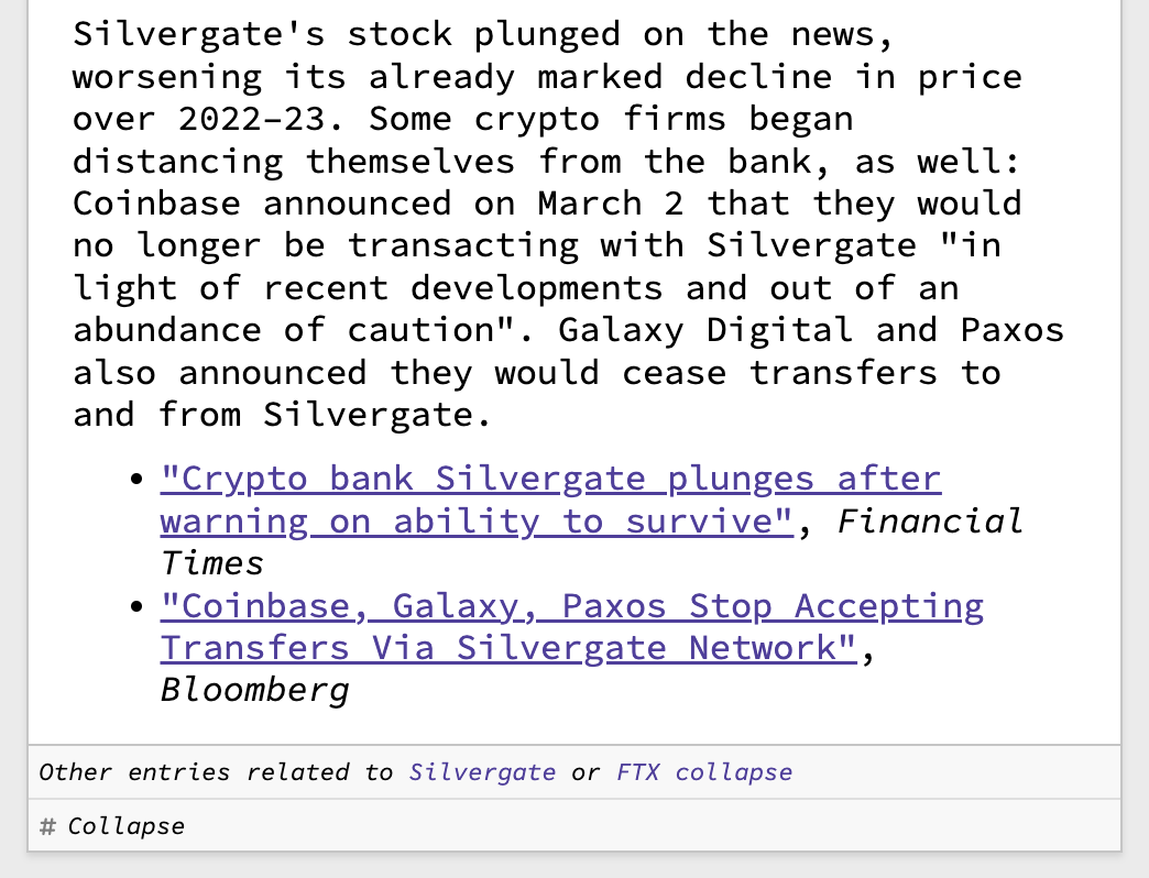 - Silvergate crypto-focused bank faces crisis Silvergate is a US bank that shifted its business toward primarily serving crypto clients. Following the collapse of FTX, there have been concerns over Silvergate's exposure to the losses experienced within the crypto industry. Short sellers piled in, making Silvergate the most shorted stock in late February. On March 1, Silvergate revealed that they would miss the deadline to file their annual report with the SEC, which they blamed on regulatory inquiries. They also revealed even more losses, which added to the massive $887 million in losses they experienced in Q4 2022. They acknowledged that the bank's "ability to continue" was a "going concern". (remote)