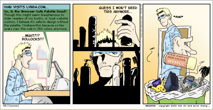 - Ivan visits lynda.com on his weird lamp-style iMac: "So, is the Browser-safe Pallette dead? Though this might seem blasphemous to our older readers, I believe it's safe to design without the palette. I believe this because so few users view the web in 256 colors any more." Ivan: What?!? Bollocks!!! Ivan: *reaches up to his shelf* I guess I won't need this any more... *throws a canister of hair coloring labeled #FFFFCC in the trash* (remote)