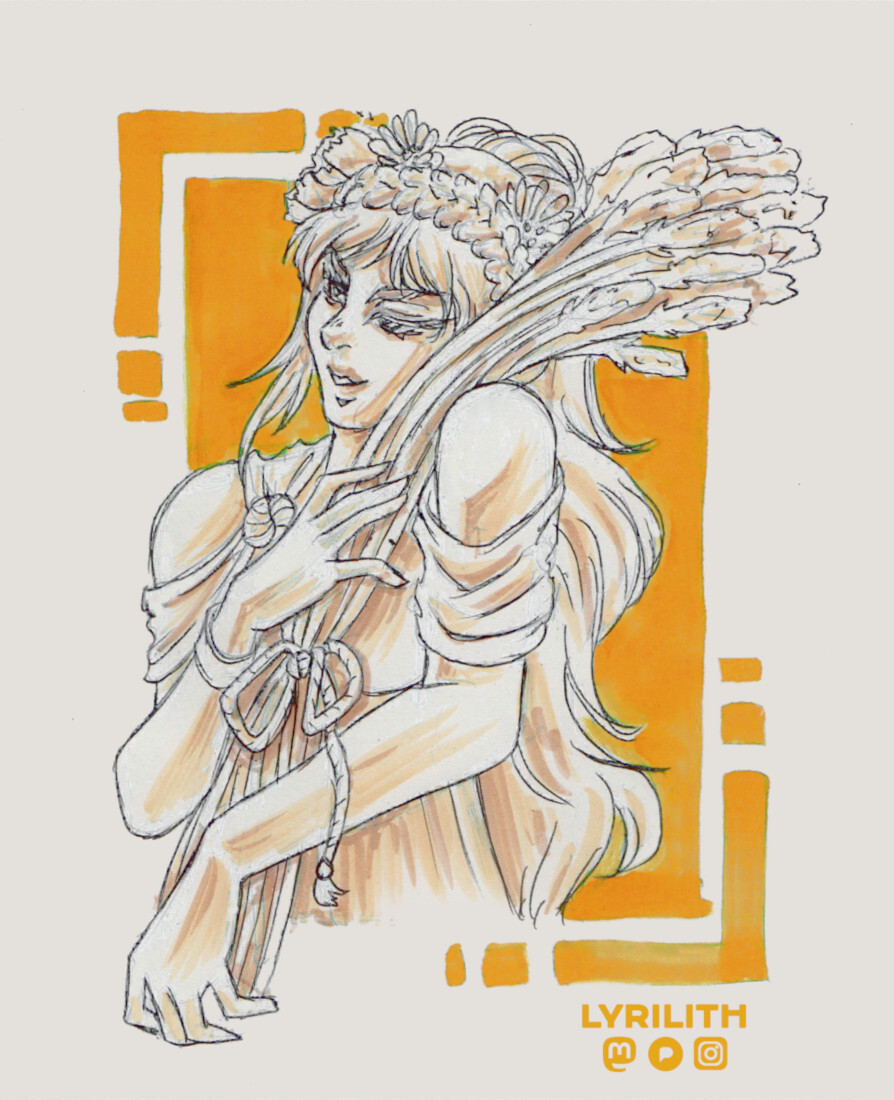 - Half body pen drawing of a woman with long flowing hair, wearing a kind of loose toga. Her hair is up in a pony tails and a braid crowns her head, decorated with a few flowers. She is holding a bundle of wheat in front of her, laid against her left shoulder, her head tilted towards it. She is turned sideways, looking away from the viewer. She is shaded in warm beige. Behind her a warm yellow rectangle is placed for contrast, decorated with a simple border. (remote)