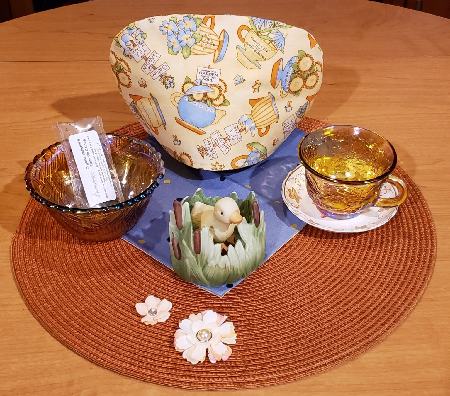 #Tea #Teableau #TeaCozy #TeaCosy #Summer #Ducks #VintageGlass #CarnivalGlass #OolongTea
