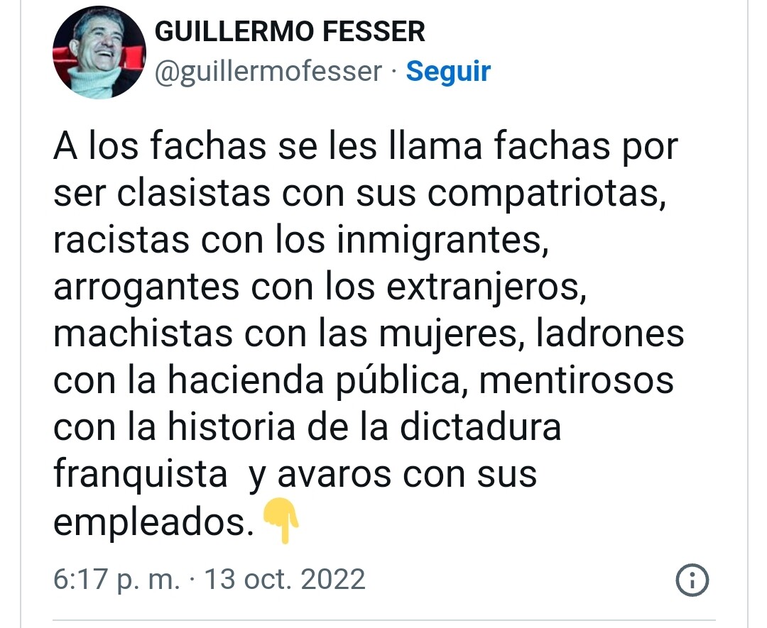 The fachas are called fachas for being classist with their compatriots, racist with immigrants, arrogant with foreigners, sexist with women, thieves with the public treasury, liars with the history of the Franco dictatorship and greedy with their employees.