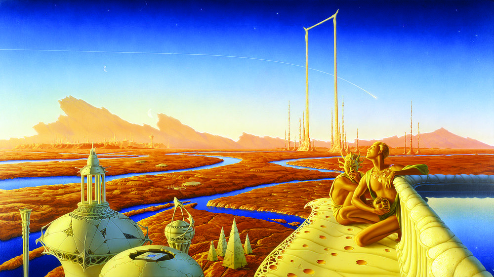 - A comet streaks across the Martian sky over a distant city and descending past a massive rectangular horned arch. Mountains run along the horizon like irregular plates jutting from its spine. The familiar red-orange of Martian regolith is broken by deep blue canals that wind through the landscape. In the immediate foreground, a trio of domed towers, each unique, dwarf tall slender pyramids clustered just beyond. Set above all that to the foreground right, a raised pool reflects the sky in a gray-blue gradient. A pair of bronze skinned humans sit next to it on an ivory overhang dotted with amber beads. The surface is elegantly patterned ending in a lace-like edging. One man holds an ornate mask over his face, casting a distinctly alien gaze at the viewer. In contrast, his companion cups his mask in his hand, exposing slightly elongated features in profile, as he gazes up at the contrail that crosses the sky. (remote)