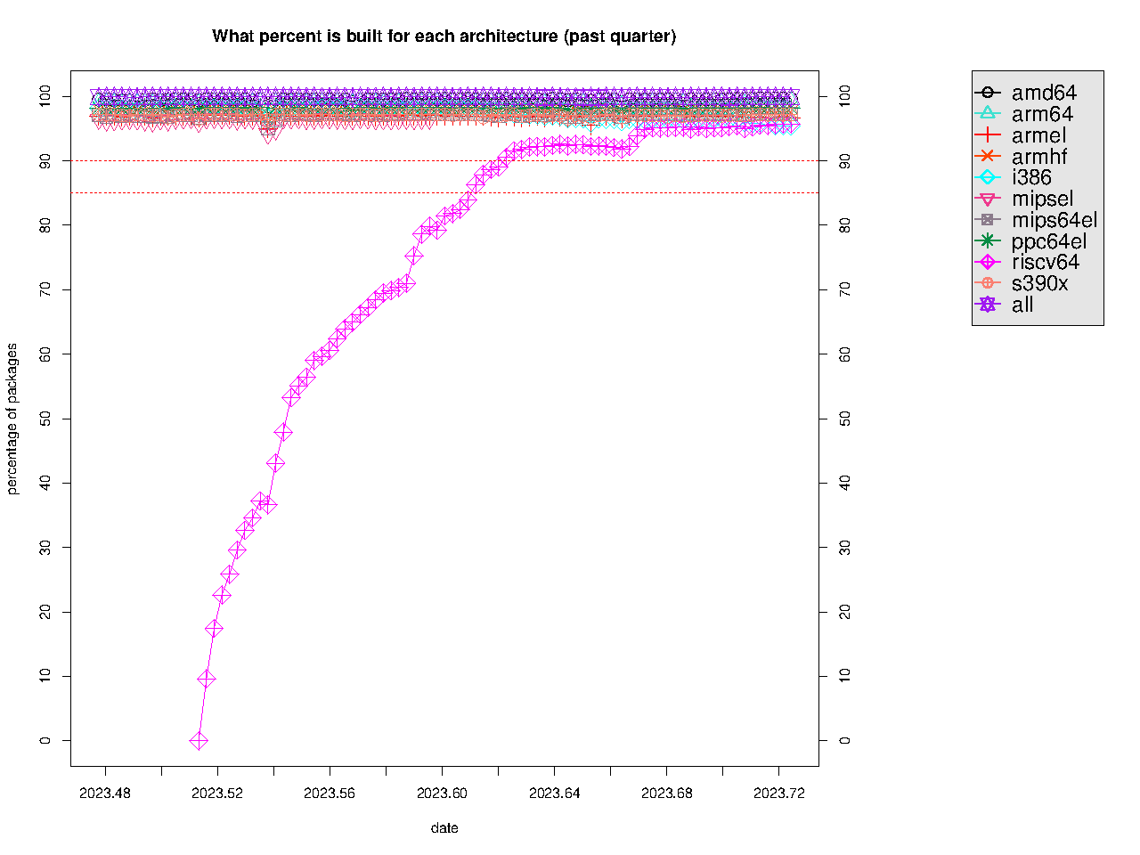 As part of RISC-V entering the official Debian archive, a full rebuild has been underway. It's made rapid progress and recently hit the milestone of surpassing i386 in terms of % packages built. Hat tip to my Igalia colleague Manuel A. Fernandez Montecelo (mafm) who's been contributing to this effort