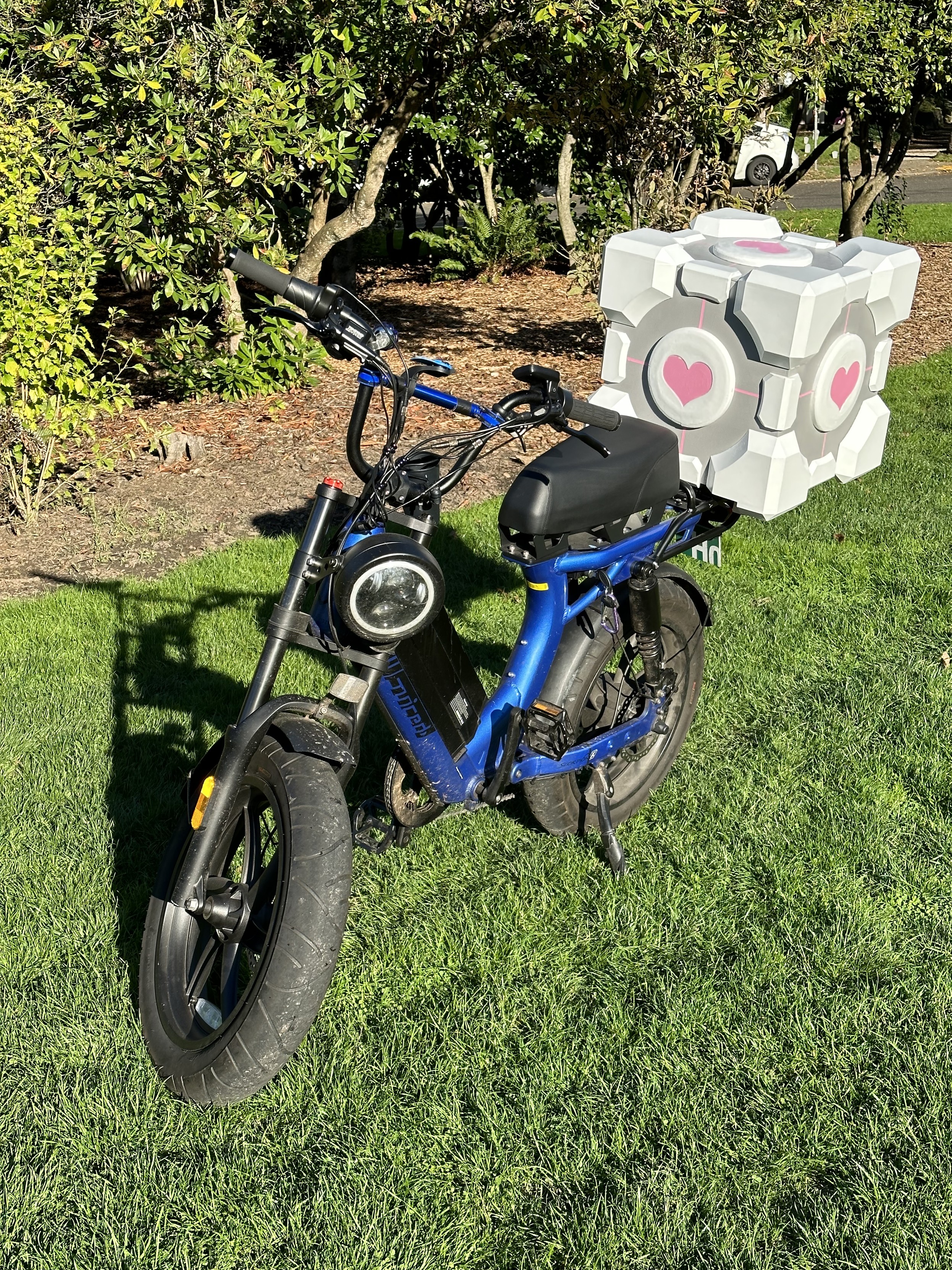 Weighted Companion Cube e-bike cargo box: functionally complete! (The bike, in case you're curious, is a Scorpion X by Juiced Bikes, and if you want an electric moped, I can heartily recommend it.)