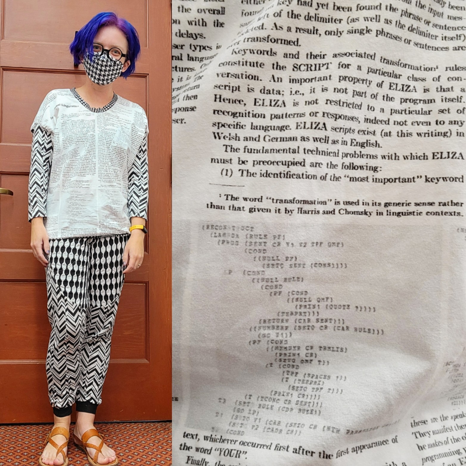 5.5 years ago I made this dolman top with the original 1966 ELIZA paper and code for the birth of my daughter with the same name. Last night I changed up the sleeves and today I'm wearing it to teach ELIZA in the undergrad AI class. #DHsewing