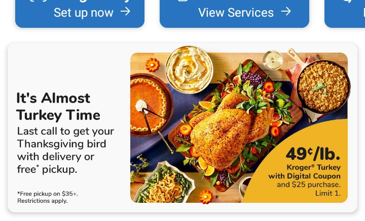 Kroger has turkeys for 49 cent per pound with a digital coupon and an order of $25.