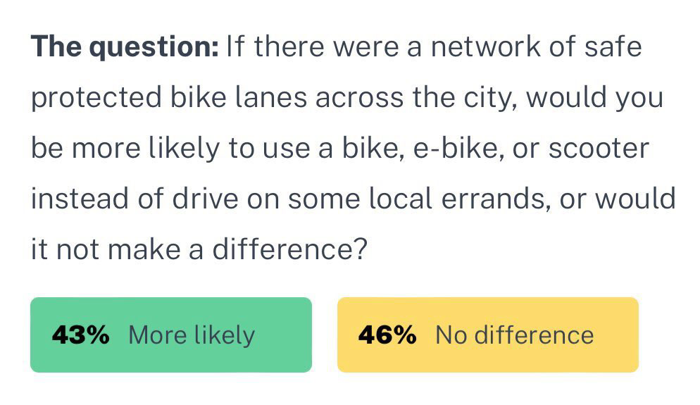 A recent citywide survey found that 43% of San Franciscans would be more likely to use a bike/scooter if there were a network of protected bike lanes.