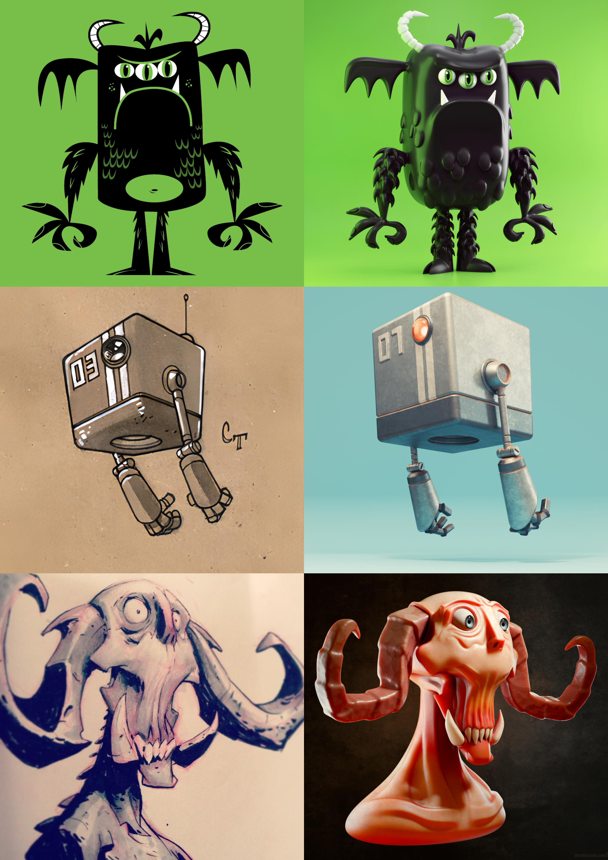 Inspiring drawings by David Semple (three-eyed monster), Chad Townsend (drone robot) and Tyson Murphy (horned demon), and my 3D interpretations.