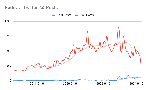 Our first statistic is the *number* of posts. As you can see, twitter lost some activity post-musk, and the fediverse took it. Big disparity, though.