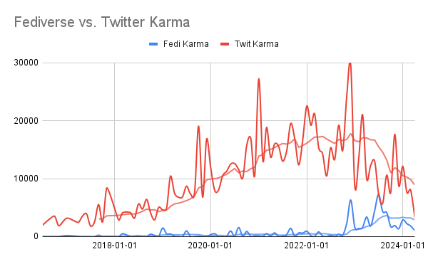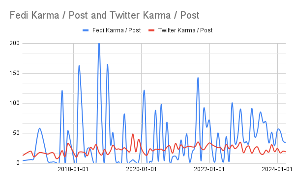Our final chart shows that posts on the fediverse are, on average, regarded slightly higher than twitter ever was.