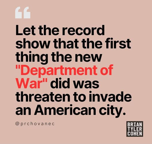 'President Trump, speaking to reporters before he departed the White House for the U.S. Open on Sunday, addressed his alarming social media post Saturday that invoked his newly rebranded Department of War and included helicopters, billowing flames and the Chicago skyline. Asked whether he was “threatening to go to war with Chicago,” Trump said: “We’re not going to war. We’re going to clean up our cities.”' https://www.nytimes.com/by/erica-l-green