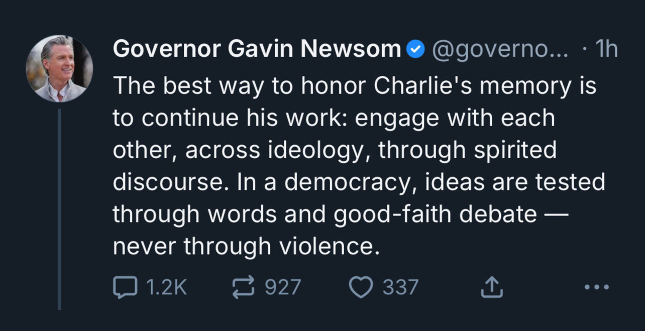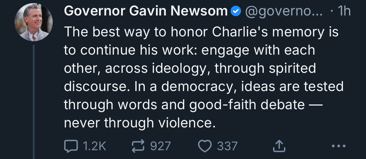 Political violence is abhorrent. I have not celebrated Kirk's death. But Newsom calling for his followers to "continue Charlie Kirk's work," someone who praised stoning gay people as "god's perfect law," who called for men to "take care of" trans people like they did in the 50s and 60s, is not it.