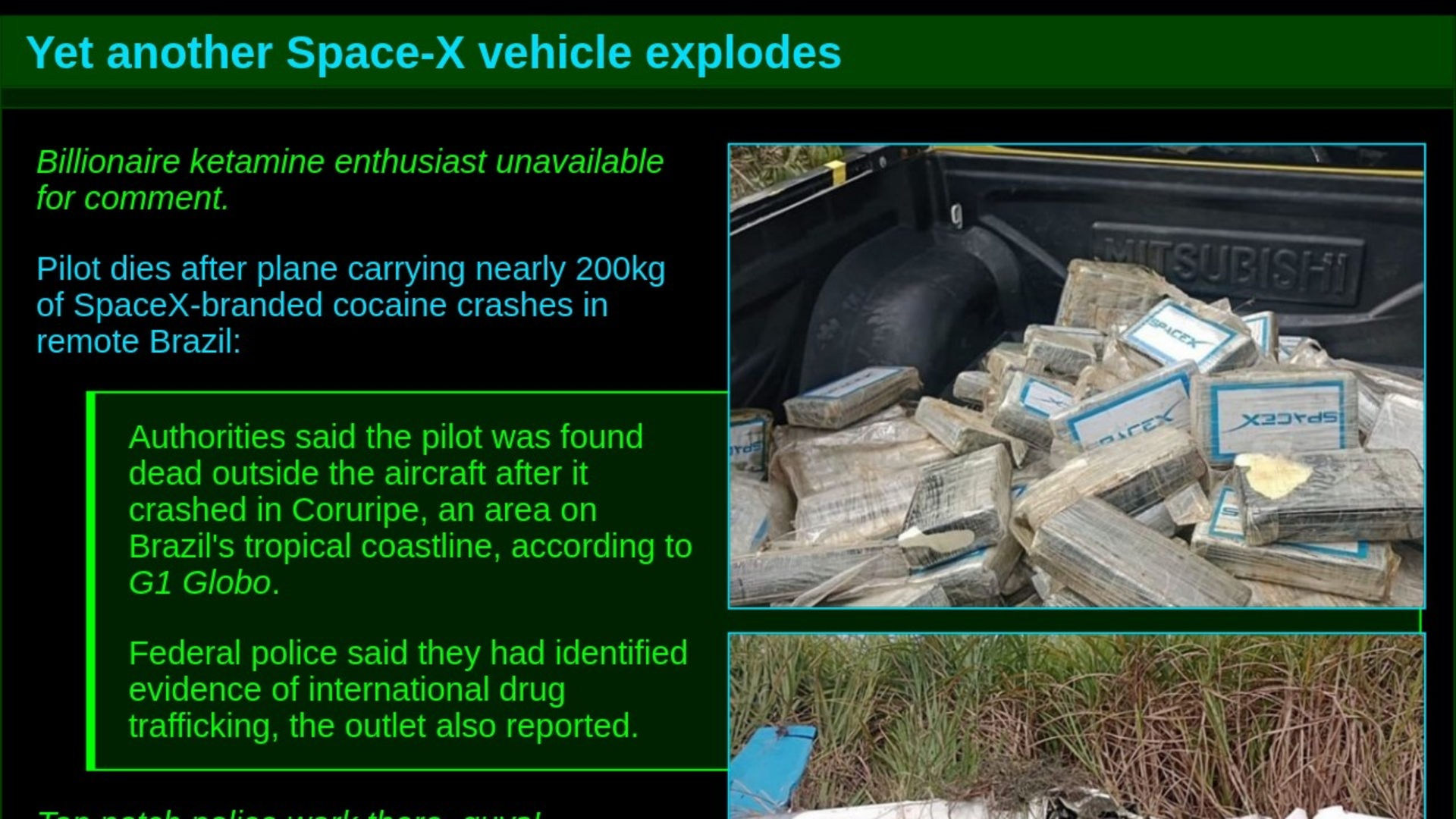Billionaire ketamine enthusiast unavailable for comment.Pilot dies after plane carrying nearly 200kg of SpaceX-branded cocaine crashes in remote Brazil: